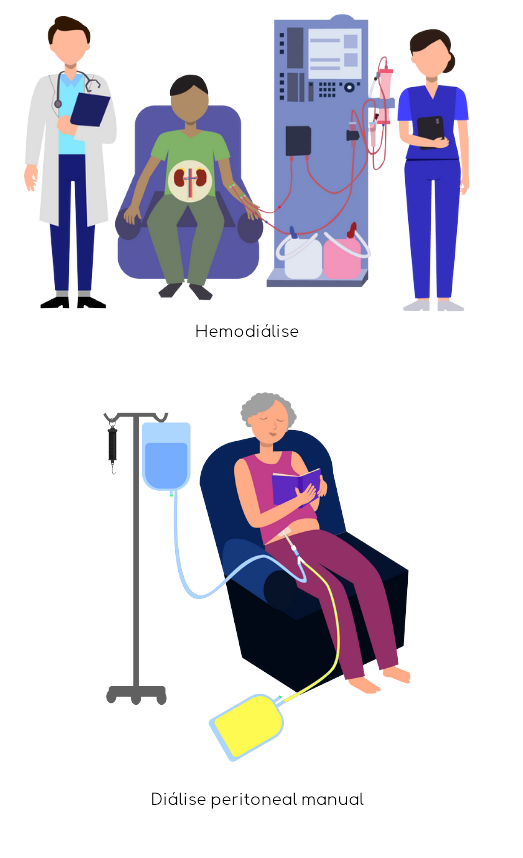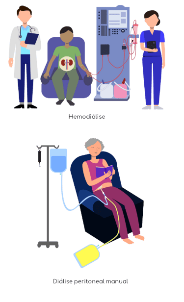 Hemodiálise: neste método, o sangue é filtrado fora do corpo. Durante a hemodiálise, as impurezas são removidas do sangue através de uma máquina especial. Os pacientes normalmente visitam uma clínica de hemodiálise três vezes por semana, onde permanecem conectados à máquina por cerca de 3 a 4 horas por sessão. O acesso ao sistema circulatório é feito por meio de um cateter ou de uma fístula arteriovenosa.